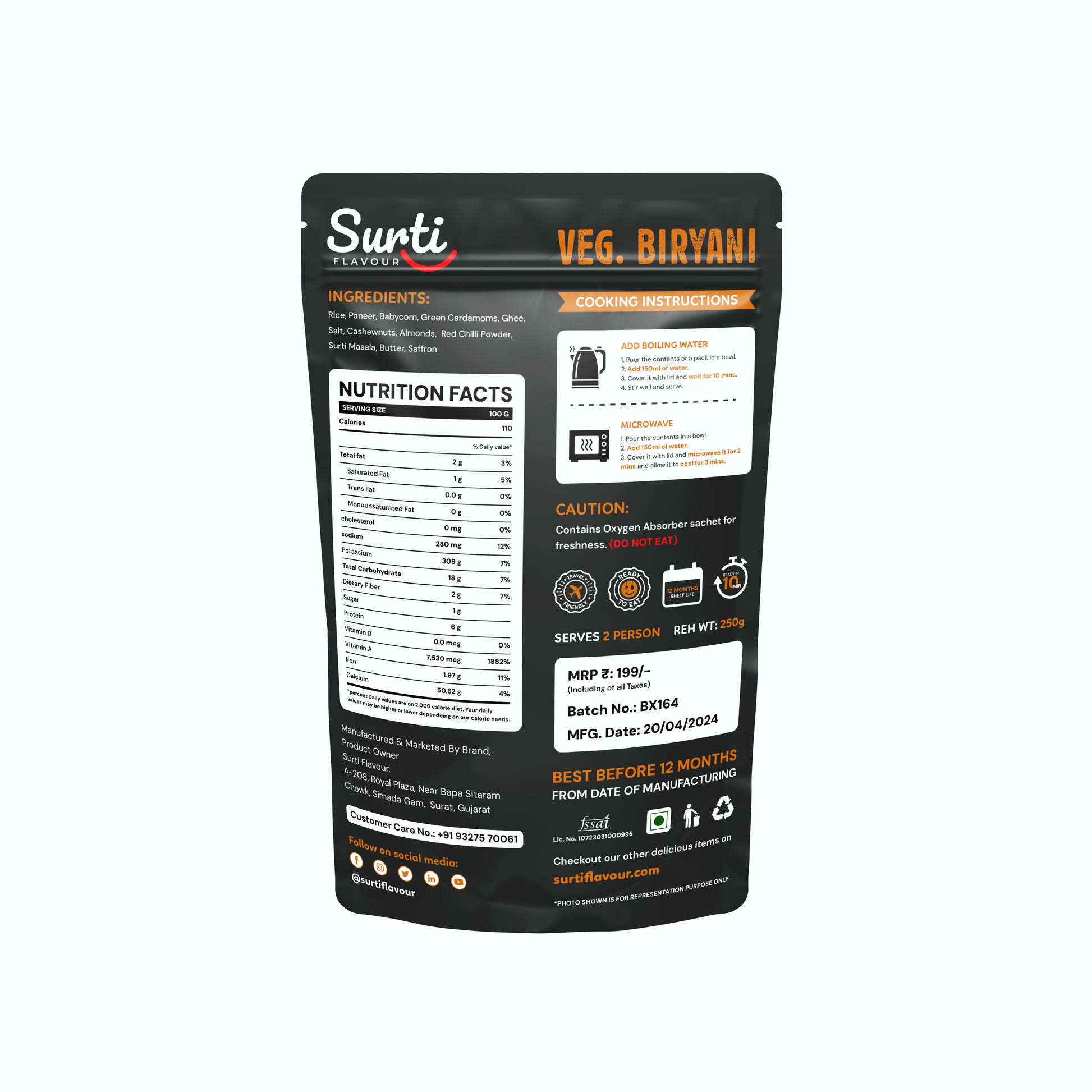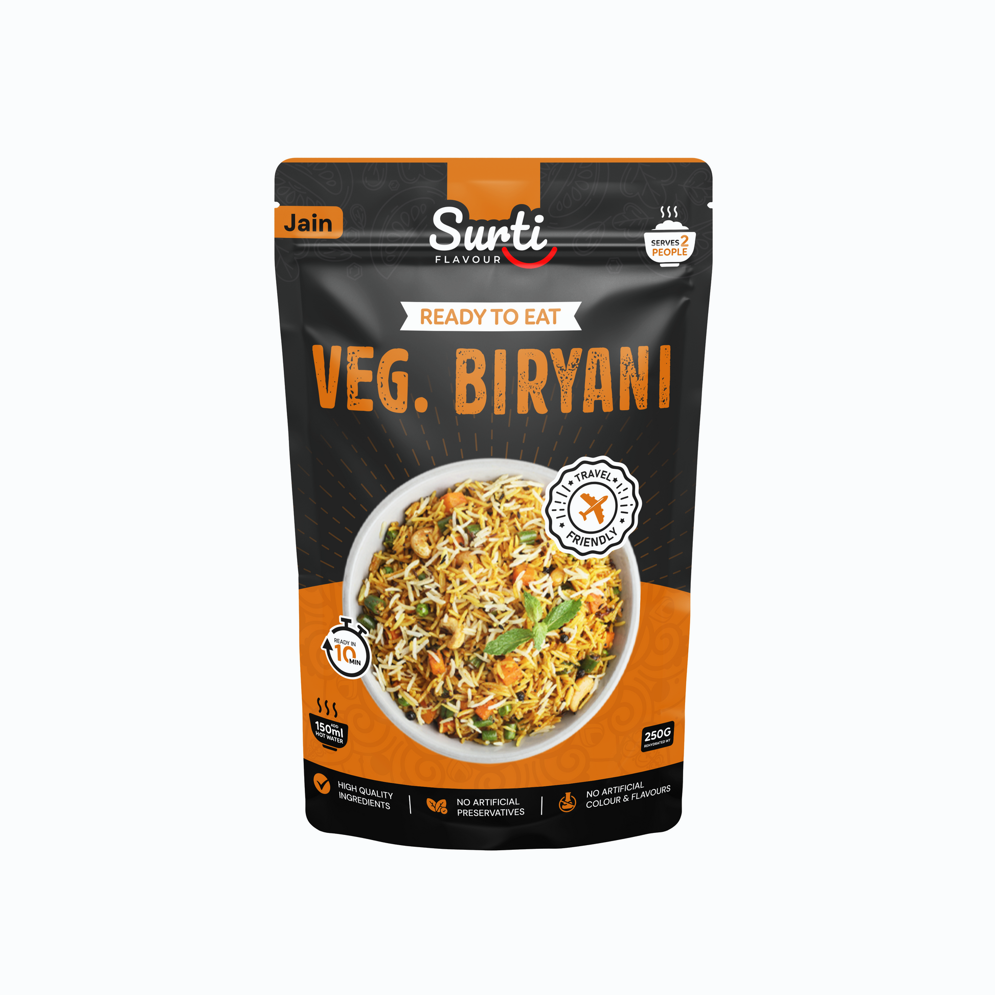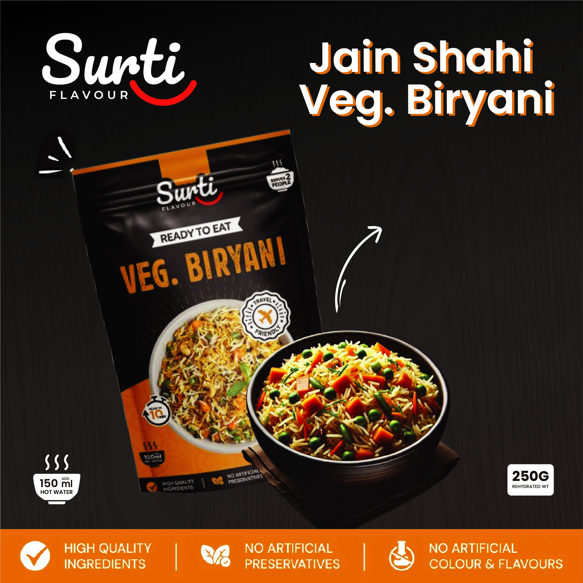 Jain Shahi Veg. Biryani is a luxurious ready-to-eat dish made with fragrant Basmati rice, vegetables, and a rich blend of spices. Garnished with cashews, almonds, saffron, and infused with ghee, it offers a royal dining experience without compromising Jain dietary rules.